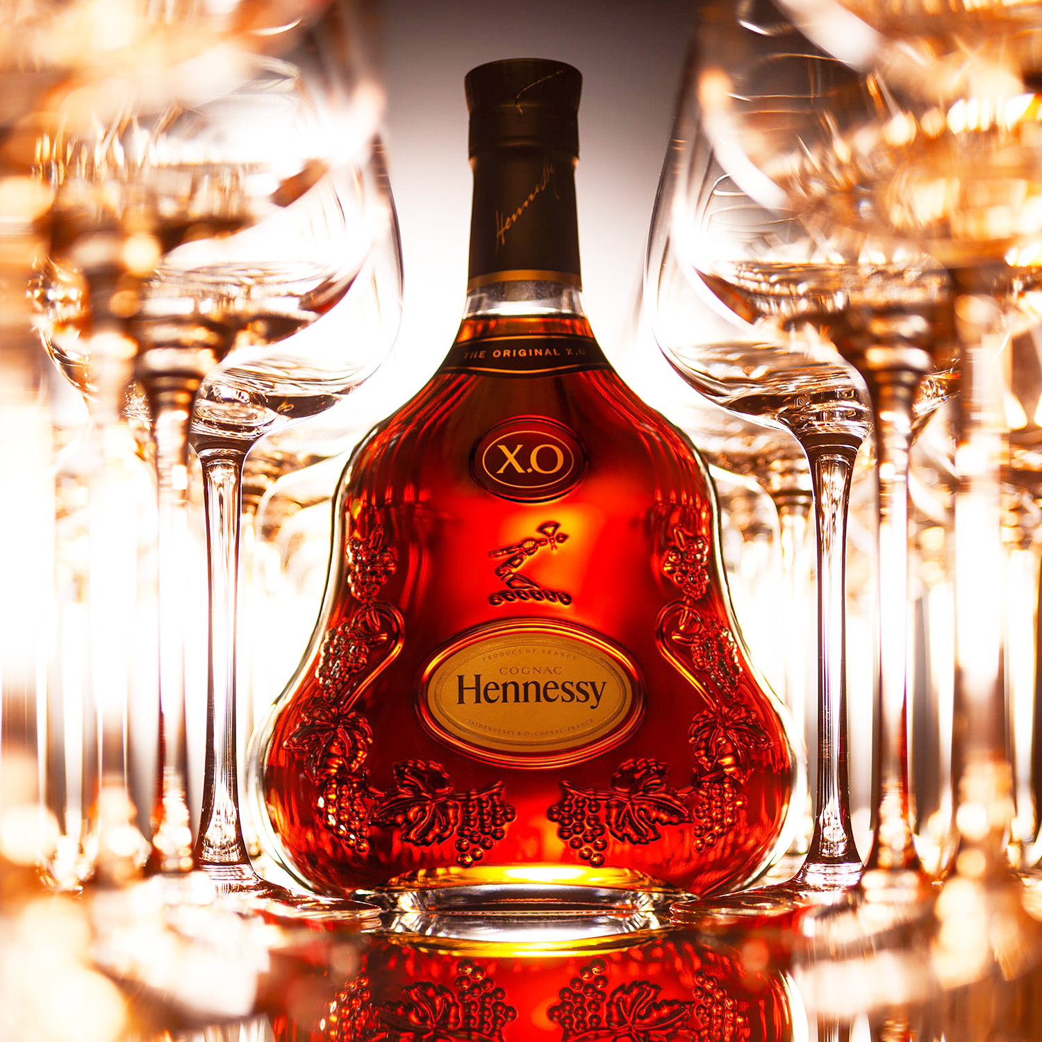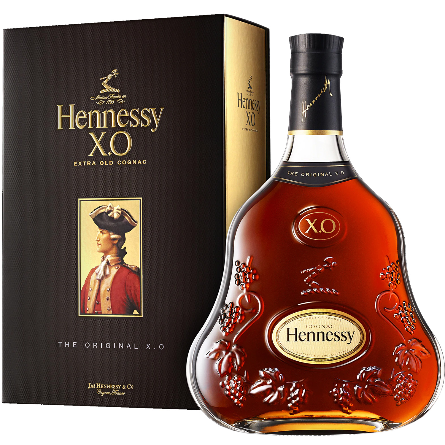 Französischer Cognac Hennessy XO mit 40 % vol. Tief und kraftvoll reifen die Eaux-de-vie dieses Hennessy X.O-Cognacs bis zu 30 Jahre.